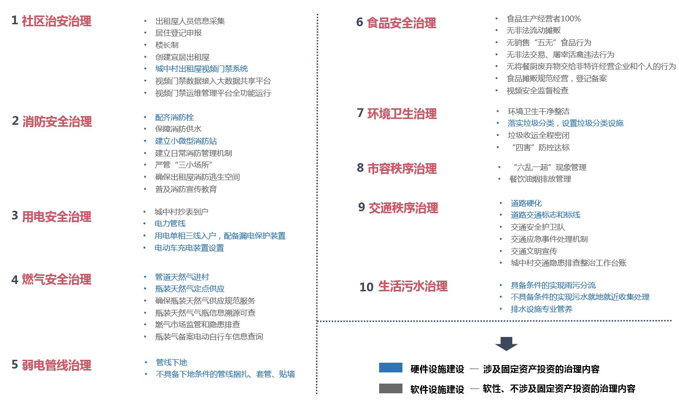 為居民者治:我們擬定了城中村社區治安治理、消防安全治理、用電安全治理、燃氣安全治理、食品安全治理、弱電管線治理、環境衛生治理、市容秩序治理、交通秩序治理和生活污水治理等十大治理行動的空間范圍、主要內容、責任分工和實施路徑,為居民建設安全、干凈、有序、和諧的文明的幸福家園。