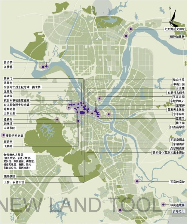 (二)歷史文化軸戰略包含文興計劃、古韻計劃、幸福計劃和文明計劃四大計劃。保護獨特的近現代城市歷史風貌,以及河湖水系縱橫交織的環境風貌特色。由高榜山、西湖、橋西和橋東四片區構成,以朝京門、合江樓、豐渚園等古建筑為點,以東江、西枝江為紐帶,南北向以西湖、中心城區歷史景點、文物古跡、特色街區為核心,連接淡水古城、平海古城,形成歷史文化主軸;東西向連接博羅、惠東形成歷史文化副軸。