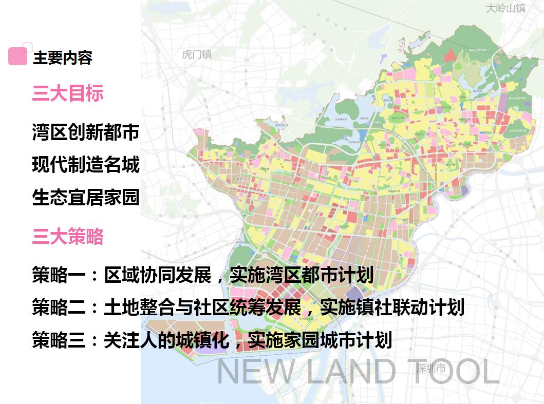 規劃的目標定位為灣區創新都市、現代制造名城、生態宜居家園。城市性質為東莞市綜合服務副中心;環珠江口國際灣區現代服務、科技創新、先進制造名城和生態宜居都市。并以區域交通基礎設施建設為先導,以重點片區開發、重點項目建設為支撐,形成“兩軸、兩核、四帶、三片區”的空間格局。