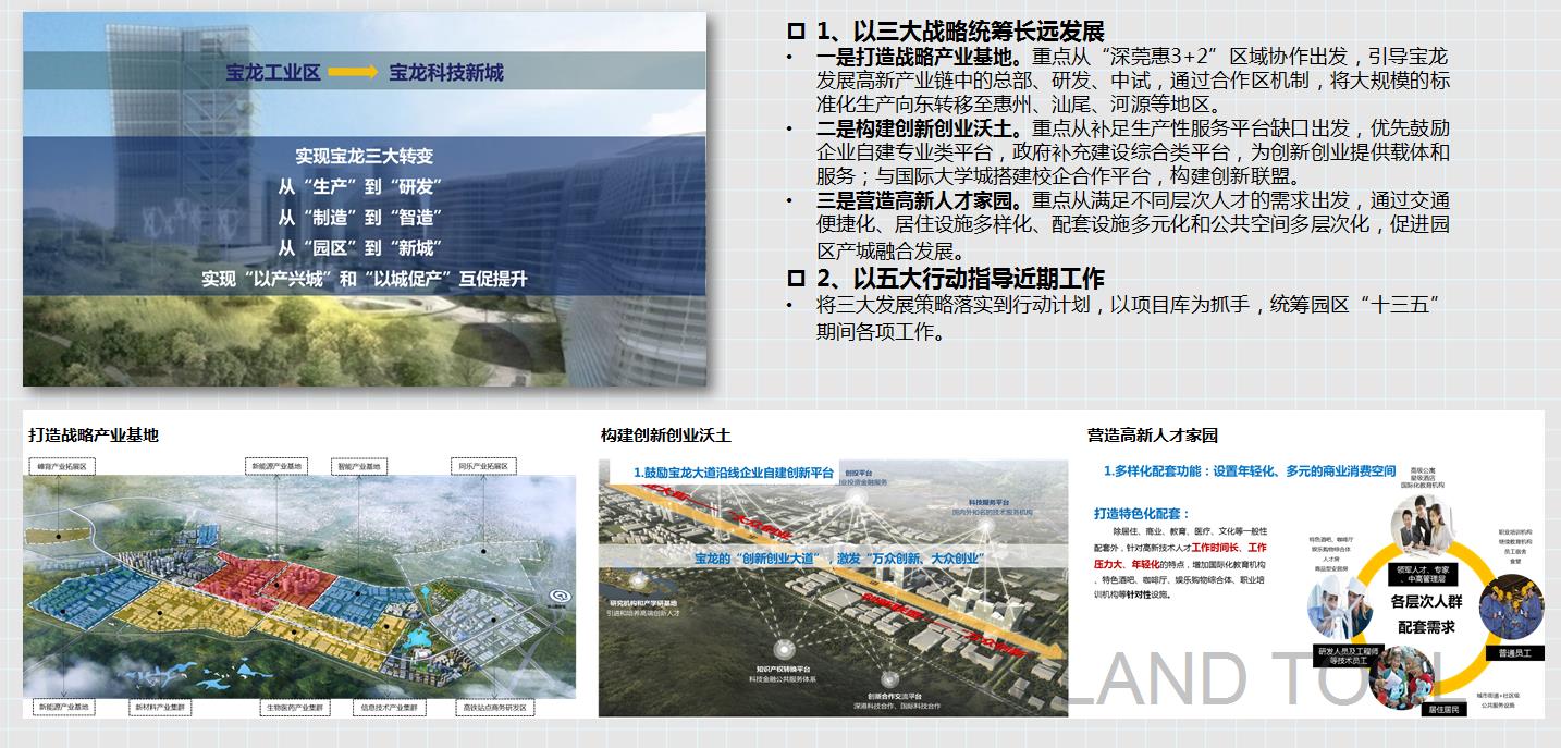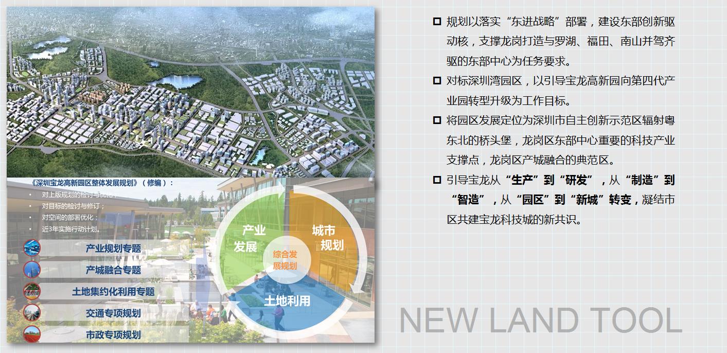 寶龍園區作為深圳高新技術園區、深圳國家自主創新示范區的重要組成部分,在深圳東進戰略的背景下,是深圳科學走廊的重要支撐點、龍崗重要的產業驅動核。在新形勢下,寶龍園區亟需重新規劃謀劃,為實現新的角色定位提供指引。綜合發展規劃構建“1+5”規劃體系(1個發展規劃+5個專題研究),從多規融合的角度,整合產業發展規劃、土地利用總體規劃、城市規劃等方面的核心內容,系統有效指導未來園區的規劃建設。